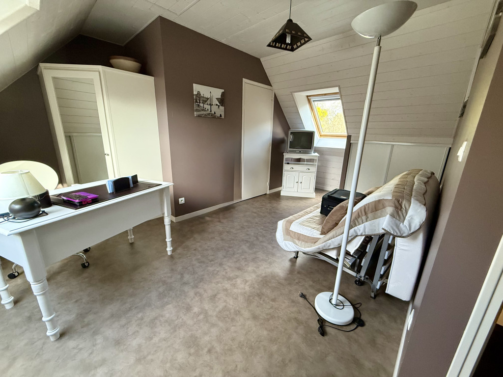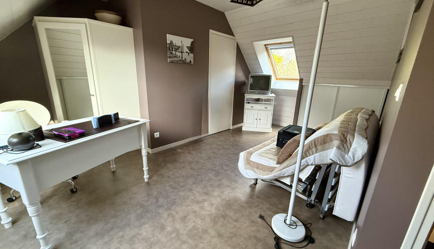 À l’étage, un palier dessert trois chambres, une salle de bains, des toilettes ainsi que des placards.
