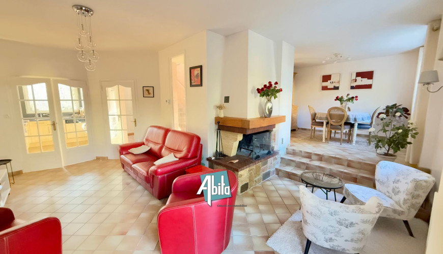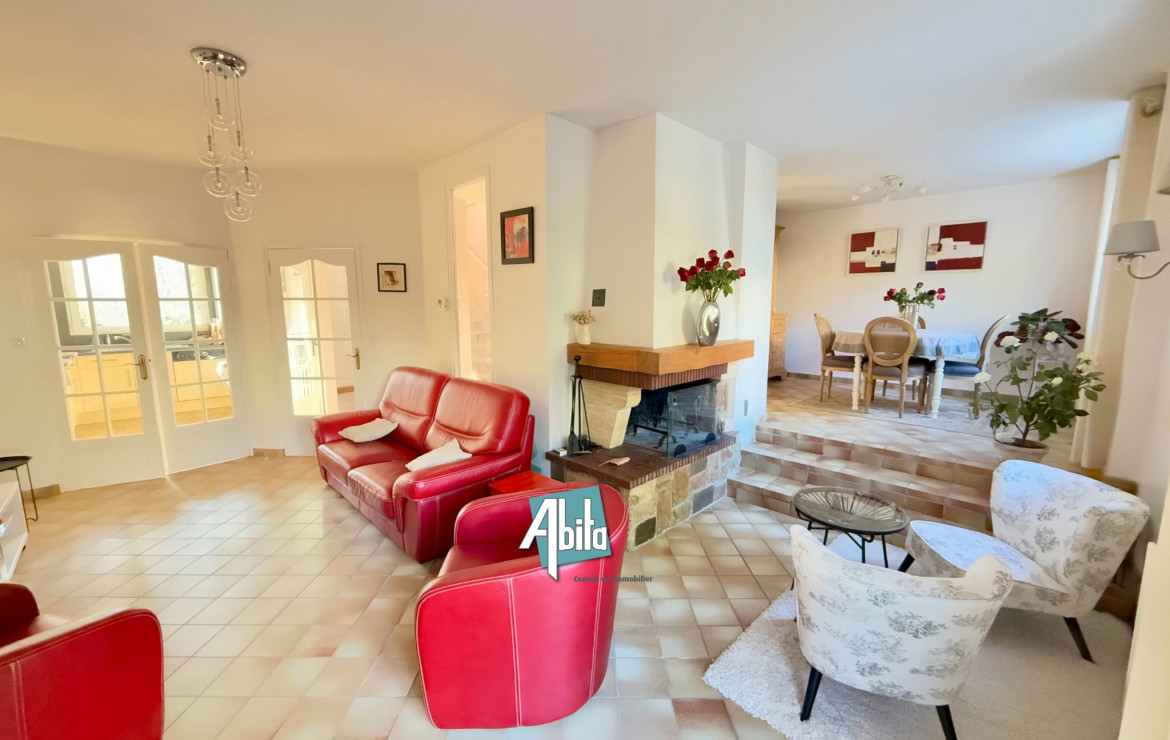Une vaste pièce de vie lumineuse avec cheminée, offrant un bel espace pour recevoir